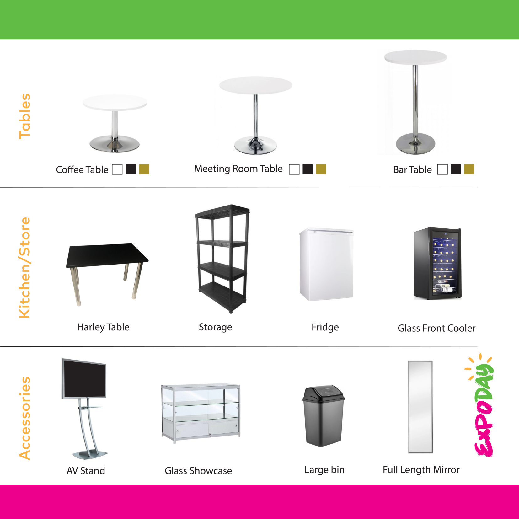 Additional quality furniture Tables / Kitchen / Accessories to add to your exhibition stand package. Advise any colour option on check out